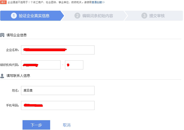 作為創業型企業,可以選擇普通企業詞條,創建詞條有以下兩個步驟: