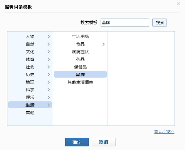 在進入編輯詞條頁面的時候,有不同模板供我們選擇,因為我們創建的是企業品牌詞條,我們搜索“品牌”的時候,自動選擇“品牌”這個模板,然后我們選擇“確定”進行下一步。